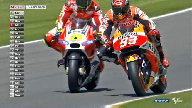 Namun terlepas dari itu, praktis keseruan motoGP Le Mans dimulai saat Vale mulai melibas satu persatu rivalnya dari posisi ke 7 untuk maju menempati posisi ke 2. Setelah itu balapan berjalan membosankan karena Lorenzo terus ngacir bahkan terus memperbesar gap dengan Rossi yang kelihatannya mulai kehabisan kompon ban setelah bertarung dengan Marquez, Iannone dan Dovisiozo..