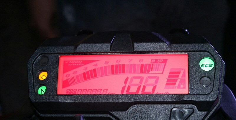 Last… Speedometer nan mungil ini rupanya juga cukup eye catching.. Karena walaupun saat siang hari berlatar hitam namun saat malam akan berubah menjadi merah… Di sana dapat kita lihay adanya tachometer, fuelmeter, odometer, tripmeter, lampu indikator sein, lampu peringatan yang akan berkedip saat motor mengalami masalah kelistrikan atau sistem injeksi, eco indicator dan lampu high beam…