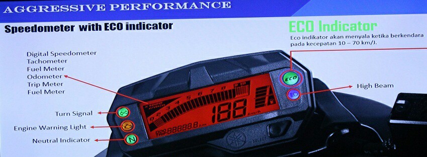 Yup… Seperti yang tertera dalam judul.. Kali ini Yamaha membenamkan lampu eco indikator di speedometer New Byson FI.. Eco Indikator yang sebelumnya juga diaplikasikan di Mio M3 ini akan sangat berguna bagi anda para rider yang berattitude halus saat riding ya bro… Lha piye??? Wong lampu ini akan menyala saat anda mengurut gas secara pelan dari kecepatan 10-70 kpj je.. So saat anda secara spontan membuka gas layaknya pebalap yang sedang start ya otomatis lampu ini akan padam saja tak mau melorok… 😀