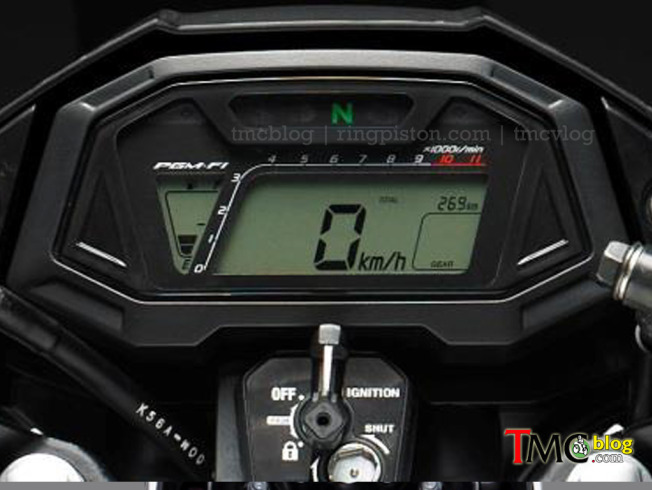 • indikator gear Netral, sein, pompa injeksi dan high beam di sebelah atas