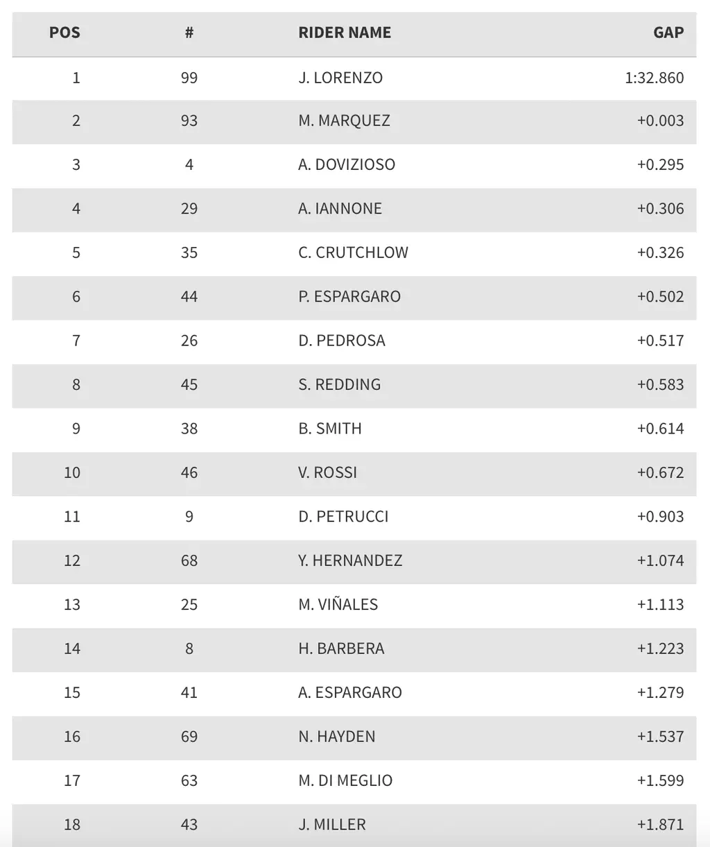 Teammate Marquez di tim Repsol Honda, Dani Pedrosa menjadi pebalap tercepat ke tujuh dengan terpaut gap +0.517 detik, disusul pebalap Marc VDS Racing Scott Redding dengan gap +0.583 detik.