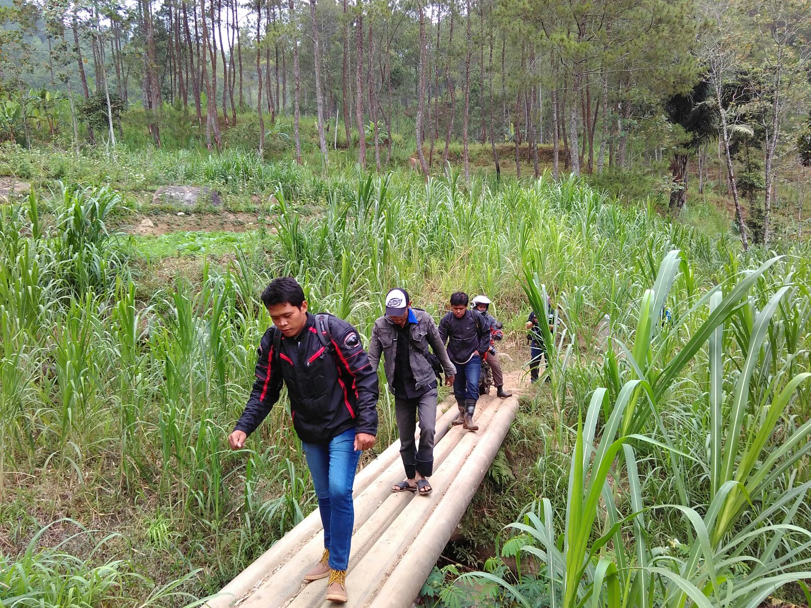 Beranjak turun setelah puas berfoto ria di hutan pinus Khayangan rombongan pun bertolak menuju Tanah Goyang, masih berada di Kecamatan Pudak. Namun untuk menuju ke tanah goyang sendiri kami harus memarkir kendaraan di halaman rumah salah satu penduduk, dan meneruskan perjalanan dengan jalan kaki. Sebab memang tak mungkin meneruskan perjalanan dengan sepeda motor, kecuali lek Azis dan lek Yusuf yang nekat mengajak si Trimbil sampai ke tempat tujuan.