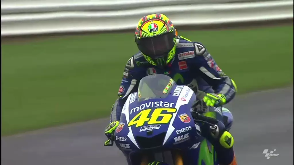 Yup, inilah Hasil Warm Up MotoGP Silverstone 2015, ternyata Rossi terdepan Berkat Hujan masbro.. Hujan yang mengguyur sejak sesi WUP pertama dibuka rupanya memberikan keuntungan bagi Valentino Rossi yang memang piawai menari di atas hujan. Sementara Danillo Petrucci lewat GP 14.3 berhasil merangsek ke posisi 2. Sementara pemegang pole position Marc Marquez membuntuti di posisi 3 dan Lorenzo harus puas di posisi 5 dengan gap hingga 1.126 detik dari Rossi yang berhasil mencetak waktu 2:18.660 detik.