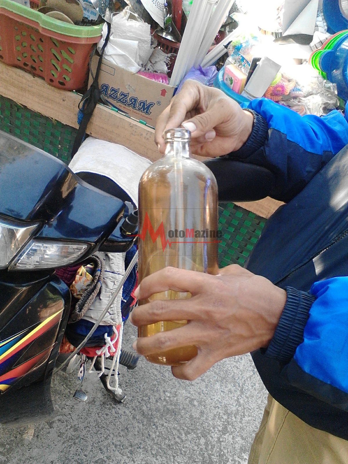 Motomazine.com – kreatif tenan bapak satu ini.. Bagi anda yang seprofesi bisa jadi alternatif. Itulah artikel ringan pagi kita bro dan sis.. Hawa dingin begini sambil nyruput kopi dan menikmati sepiring pisang goreng sepertinya mantap 😀 Yup, kejadian ini tepatnya terjadi kemarin (29/8/2015) saat seorang bapak penjual alat-alat dapur mencoba mengisi bahan bakar (bensin).