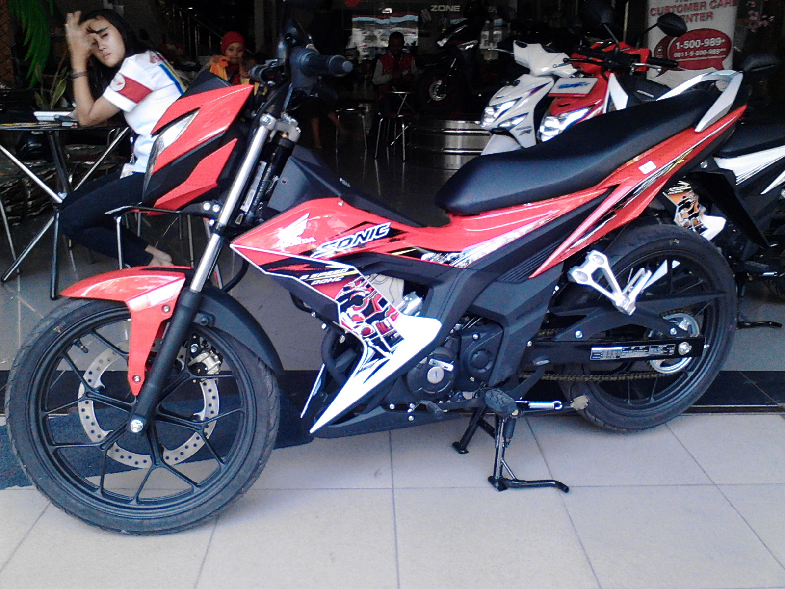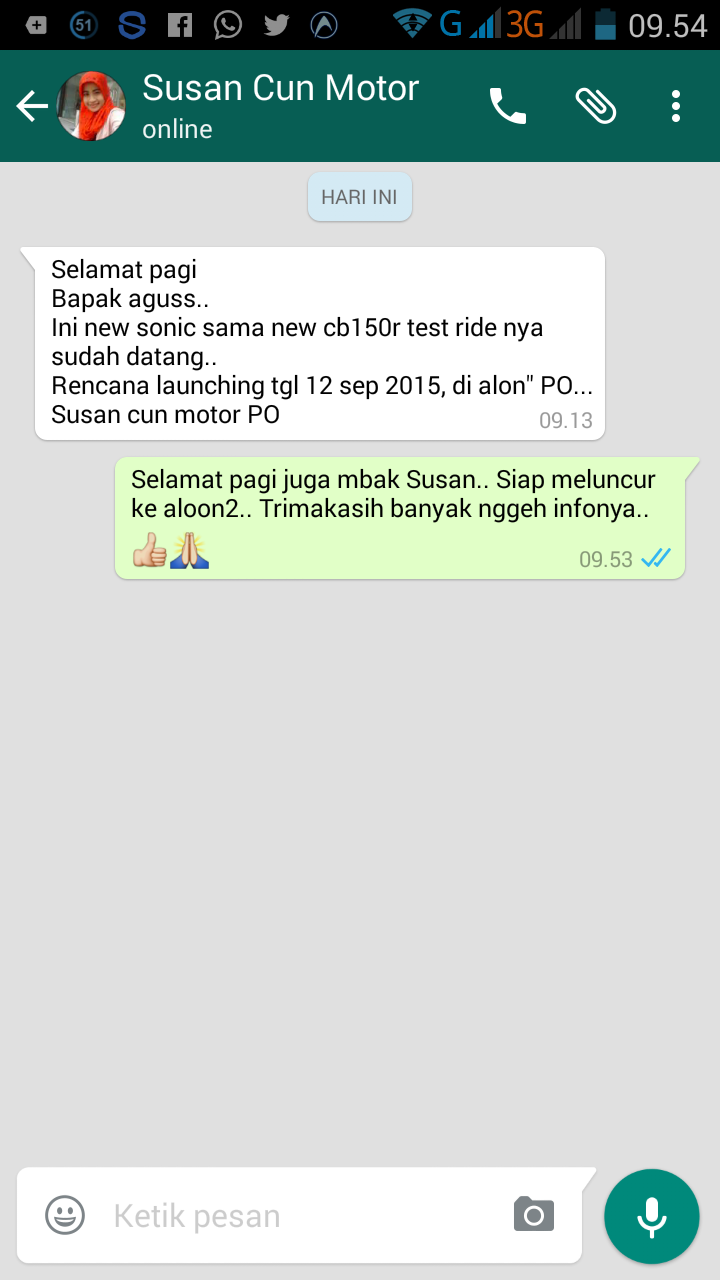 Saat sedang asyik-asyiknya bercumbu dengan LCD komputer tetiba hape jadul motomazine berbunyi. Dan isinya adalah, sebuah notifikasi dari mbak divisi marketing sebuah dealer Honda CUN Ponorogo yang memberi kabar tentang launching dua produk sport terbaru AHM, all new CB 150R dan New Sonic 150R. Suwun mbak Susan.