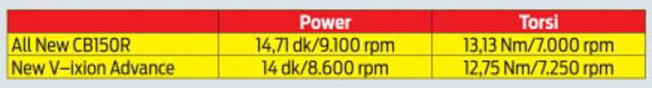 New Vixion Advance 14HP@8.600 rpm, dengan torsi 12,75 Nm@7.250 rpm. Sedangkan New CB150R mempunyai power puncak 14,71 HP@9.100 rpm dengan torsi 13,13 Nm@7.000 rpm.