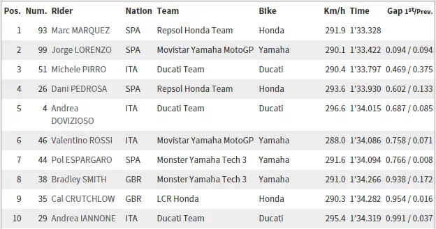 Seperti biasanya, Marc Marquez pebalap handalan tim Repsol Honda berhasil menjadi yang tercepat dengan membukukan waktu hingga 1:33.328 detik, disusul Jorge Lorenzo yang lebih lambat 0.094 detik. Sedangkan pebalap tuan rumah, Valentino Rossi masih santai di posisi enam dengan torehan waktu 1:34.086 detik. Atas hasil ini Rossi tertinggal 0.758 detik atas Marquez.
