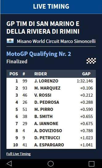 Dengan hasil ini, 1:32.146 detik selain menobatkan Lorenzo sebagai pebalap tercepat dan berhak menempati posisi start terdepan saat race esok hari, Lorenzo juga berhasil memecahkan rekor sirkuit Misano yang sebelumnya dipegang oleh Marc Marquez dua tahun silam dengan torehan waktu 1:32.915 detik.