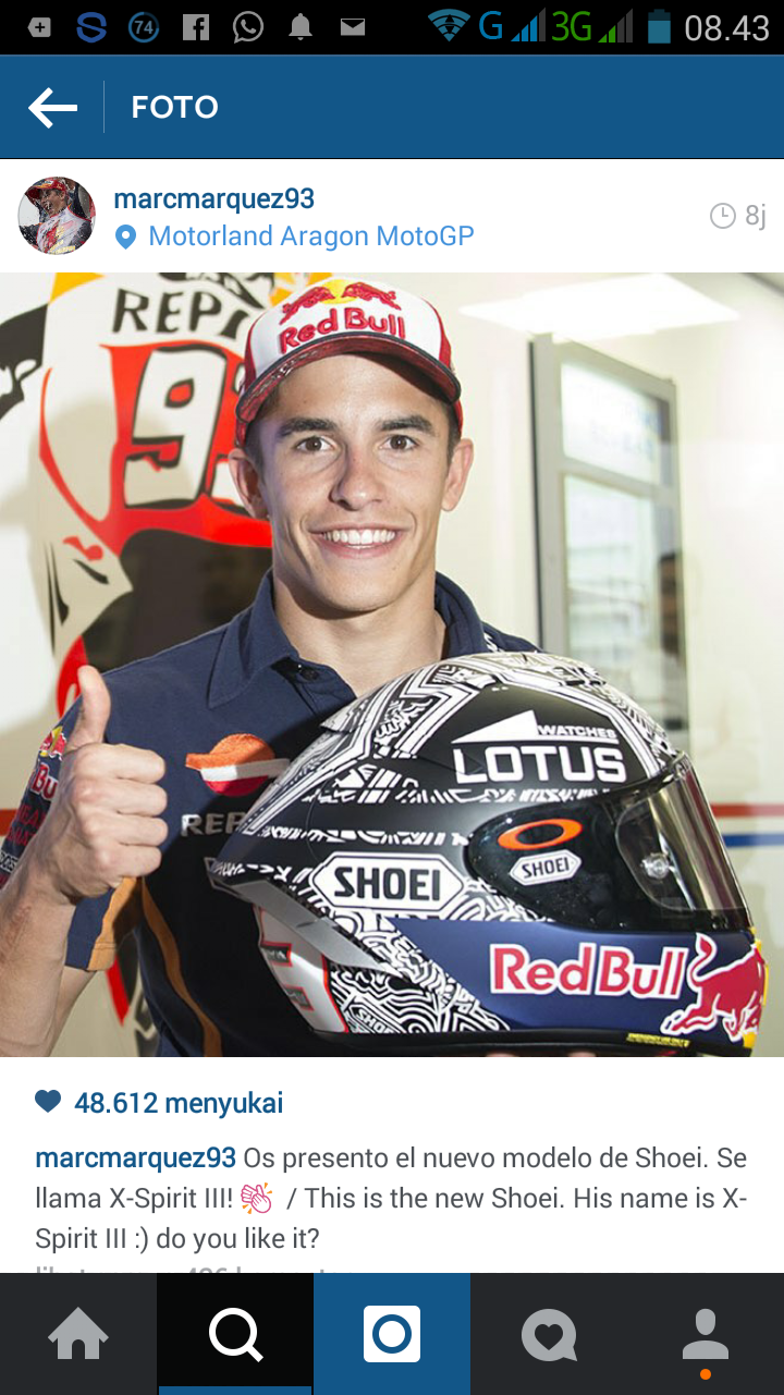 Melalui akun instagramnya, pebalap Repsol Honda Marc Marquez rupanya telah memperkenalkan helm Shoei terbarunya. Dinamai Shoei X-Spirit III Marc berharap helm ini akan membawa nasib baik bagi dirinya sekaligus pemompa semangat guna menjalani race Aragon, hari Minggu mendatang (MMz/red).