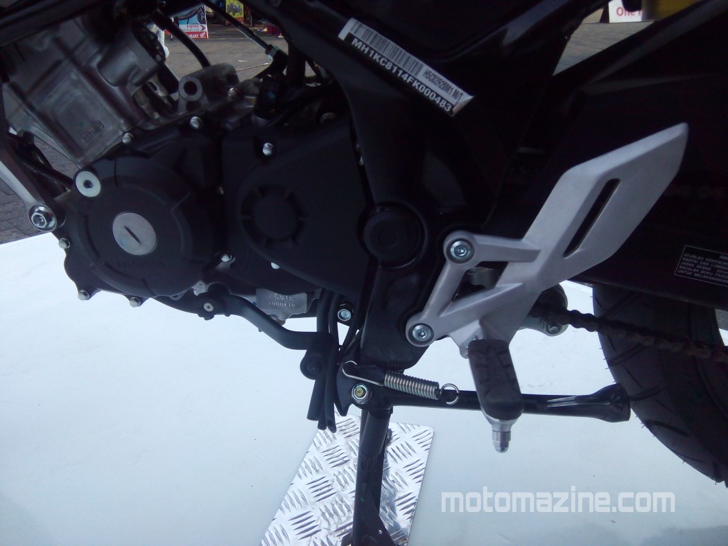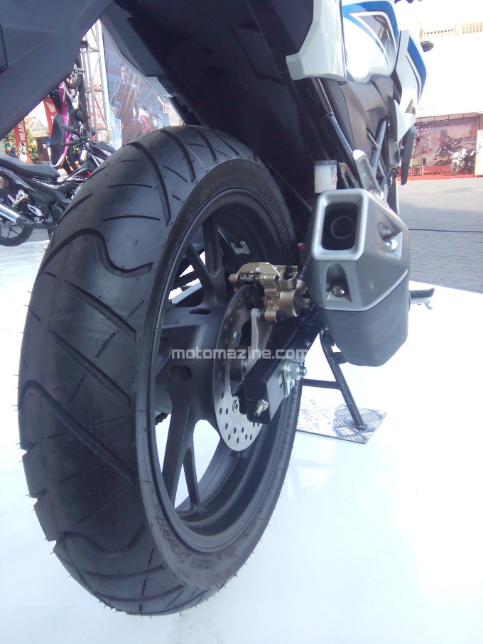 Untuk sektor kaki-kaki, jujur… Bagian inilah yang menurut MMz paling yahud. Dibekali velg cast wheel palang ‘Y’ 17″ dan dibalut ban 100/80-17 depan serta 130/70-17 belakang membuat New CB150R jauh lebih kekar daripada pendahulunya. Bahkan ukuran ban ini setingkat lebih besar dibanding kompetitor.