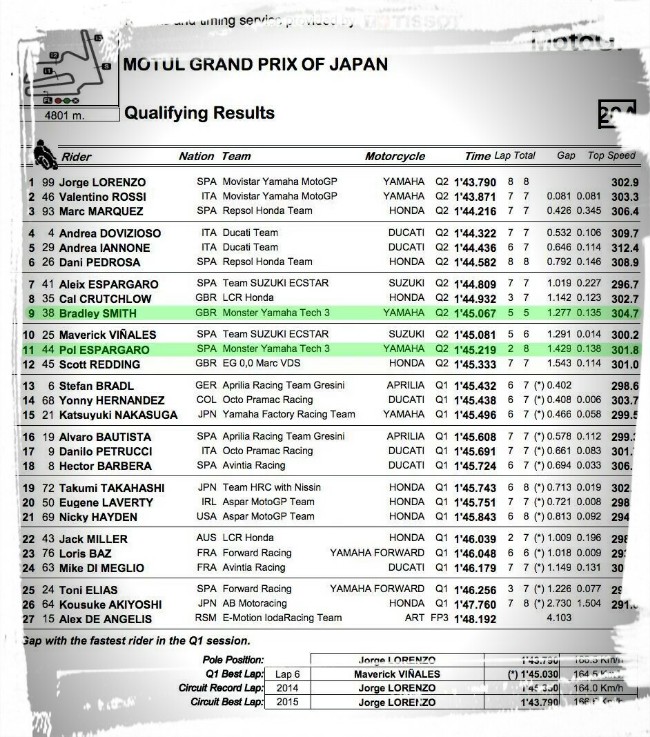 Dengan hasil ini walaupun Lorenzo berhasil mendobrak waktu hingga 1:43.790 detik, sepertinya doi belum akan mampu bernafas lega di balapan esok. Sebab Rossi tentu juga akan sangat kuat. Belum lagi Marquez yang akan start dari posisi tiga. Serta jangan lupakan duo Ducati yang pasti juga akan luar biasa karena berhasil menduduki posisi empat dan lima..