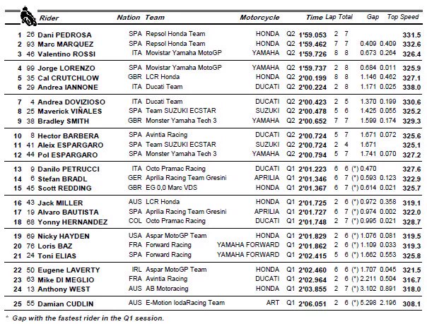 Sementara rekan setim Pedrosa, Marc Marquez berhasil berada diantara keduanya dengan torehan waktu 1’59.462. Namun diantara ke empat alien ini rupanya Lorenzo sedikit kurang beruntung. Pasalnya pebalap rekan senegara Marc ini hanya berada di posisi tercepat ke empat dengan gap hingga 0.684 detik atas Pedrosa.