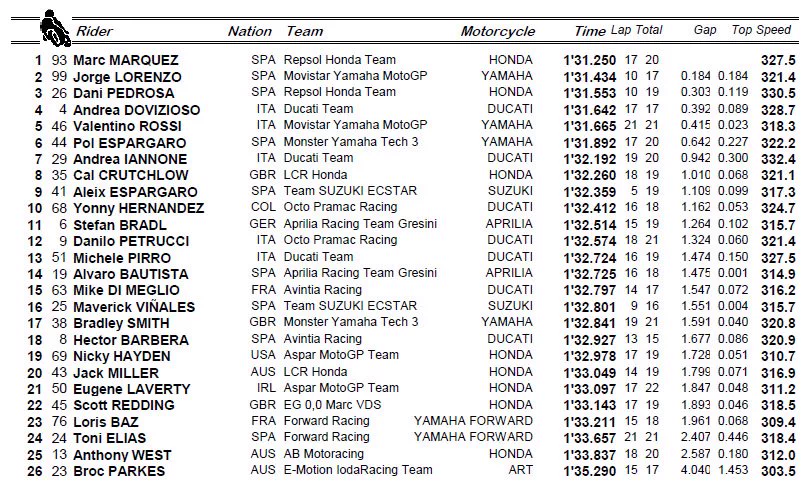 Yang cukup menggembirakan yakni Rossi nan terlihat tak langsung patah arang dan berhasil membuat catatan waktu lumayan kompetitif. Rossi yang berada di posisi lima pada sesi latihan bebas pertama ini terpaut 0.415 detik atas Marquez yang berhasil nangkring di posisi pertama dengan torehan waktu 1’31.250 detik.