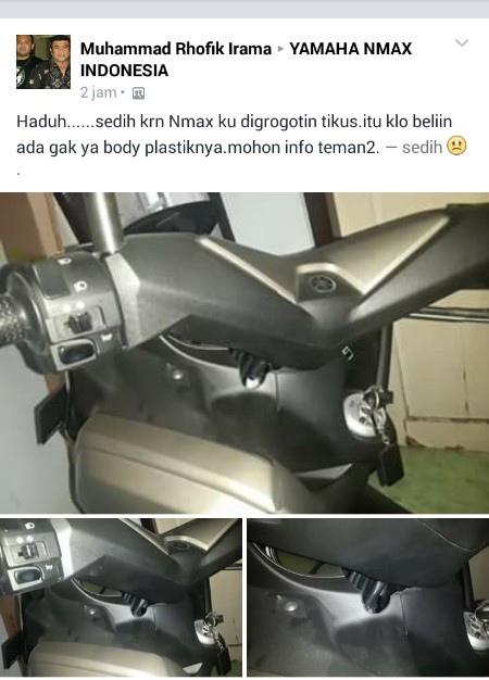 Adalah bro Muhammad Rhofik Irama yang mengunggah foto NMax kesayangannya dalam keadaan berlubang sehabis digerogoti tikus. Jika biasanya tikus hanya menyerang kabel-kabel bodi atau karet-karet yang ada di motor, rupanya kali ini mereka juga penasaran akan rasa dari plastik bodi, dalam hal ini Yamaha NMax.