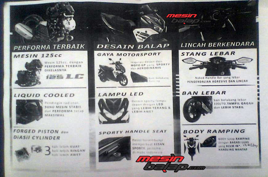 Motomazine.com – salam safety riding bro sis.. Yamaha Aerox 125 memang semakin berani menunjukkan jati dirinya. Setelah sempat beredar foto-foto jelasnya tanpa aling-aling dan watermark, kali ini muncul lagi bocoran spesifikasi Yamaha Aerox 125 yang sebentar lagi bakal dirilis. Namun sebuah pertanyaan yang mengganjal MMz adalah, mana tulisan Blue Core dan teknologi VVA yang sebelumnya pernah digembar-gemborkan itu..???