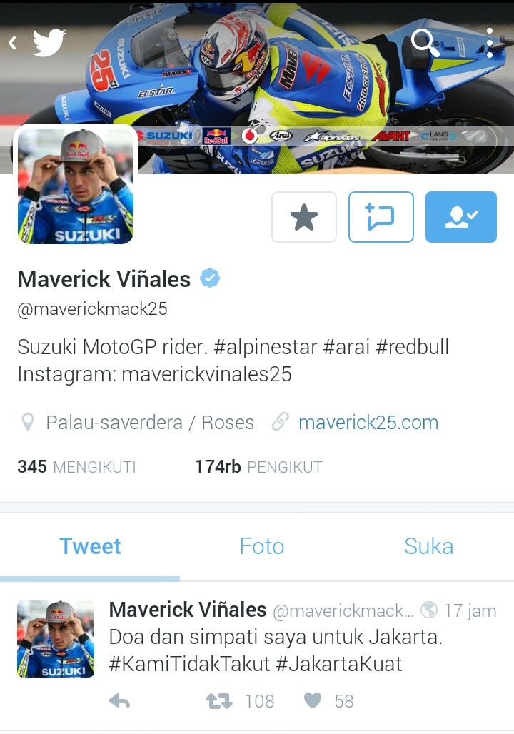 Begitupun dengan pebalap MotoGP dari tim Suzuki Ecstar, Maverick Vinales yang juga menyatakan doa dan simpatinya untuk Jakarta. Vinales yang menggunakan nomor start #25 di kuda besi pacuannya ini rupanya juga cukup mahir melafalkan bahasa Indonesia.