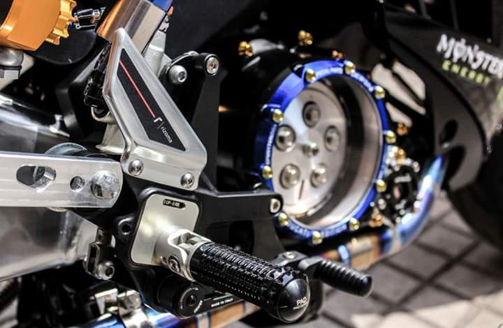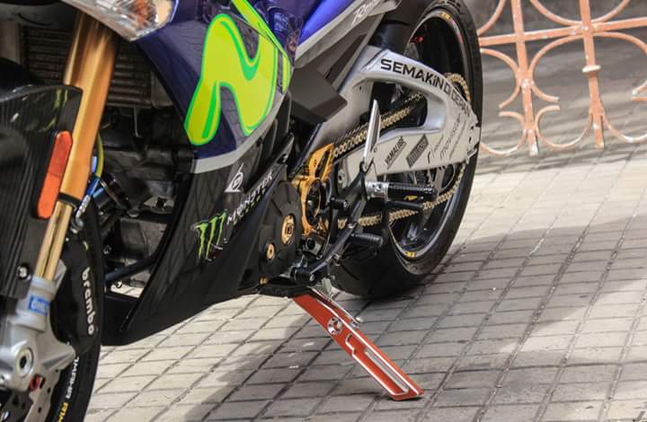 Sepertinya part-part modifikasi yang ditanamkan di motor ini bisa dibilang lumayan berat. Dimulai dari pengaplikasian shock depan USD serta swingarm alumunium model banana sukses membuat tampilan sang bebek super berkubikasi 150cc ini terdongkrak cukup signifikan.