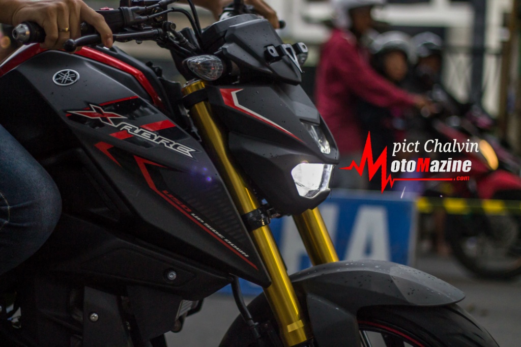 Tapi kalau Yamaha XABRE sih menurut MMz mending tetep taruh plat nomornya di jidat saja.. Wong motornya sudah keren kok.. Masa takut terciderai dengan plat nomor.. Malah kalau berdasarkan pandangan MMz pribadi, posisi plat nomor di bawah headlamp itu akan menciderai bengisnya model headlamp dan gagahnya suspensi upside down nya…. (MMz)