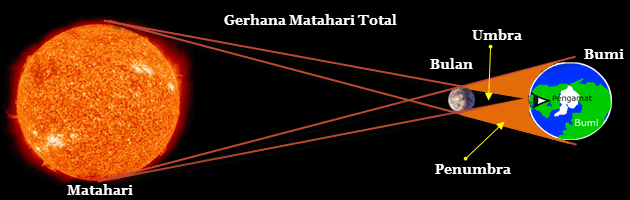 Nah, sekarang permasalahannya adalah ketika terjadi gerhana matahari itu sendiri. Gerhana matahari terjadi akibat sinar matahari ke bumi terhalang oleh bulan. Sebab posisi bumi, bulan dan matahari berada pada posisi sejajar. Lantas hubungannya dengan kerusakan mata..??? Seperti penjelasan di atas, saat gelap pupil kita membesar maksimal. Nah, gerhana matahari terjadi saat bulan menutupi matahari. Artinya bumi dalam kondisi gelap. Secara otomatis pupil kita pun membesar untuk menyesuaikan agar mata tetap mampu melihat seperti keadaan normal. Jadi, jika anda memaksakan melihat gerhana matahari langsung artinya anda melihatnya dengan kondisi pupil membesar maksimal. Dan perlu anda tahu, meskipun tertutup bulan namun radiasi matahari yang mengandung sinar UV itu tetap langsung menerpa pupil mata kita. Efeknya, jelas.. Retina kita bisa terpanggang. Sekali lagi, ini sangat berbahaya…
