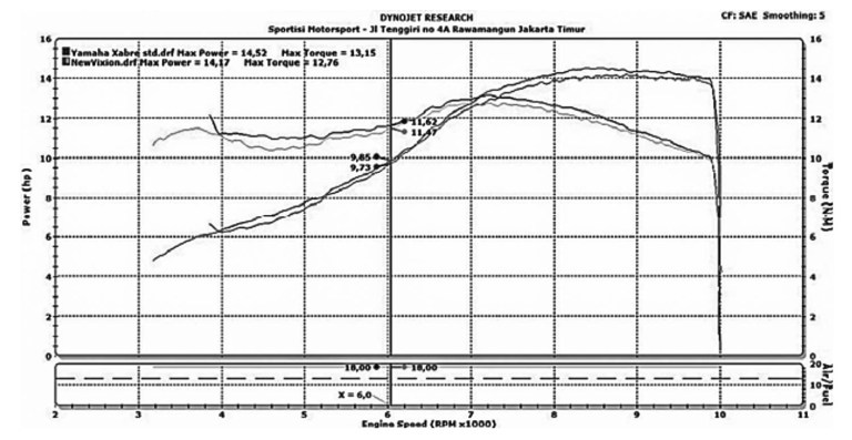 Dari data pengetesan mesin dyno di atas memang terbukti jika Yamaha XABRE ternyata memiliki power dan torsi di atas New Vixion.