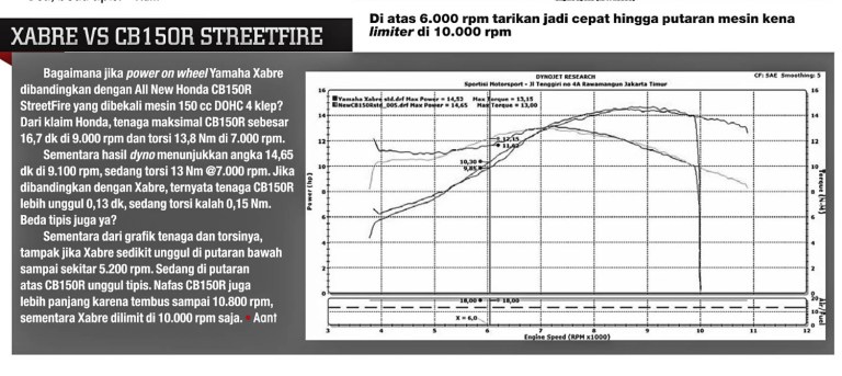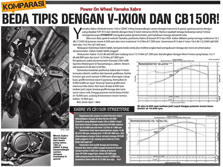 Adalah IWB yang mendapatkan share dari rekan-rekan otomotif perihal dyno test yang dilakukan di bengkel sportisi Rawamangun menggunakan mesin dynojet 250i. Yamaha XABRE sendiri dibekali dengan mesin 150cc 4 tak SOHC dengan percepatan 6 speed yang diklaim mampu memuntahkan tenaga hingga 16,1 HP pada kitiran 8.500 rpm serta torsi mencapai 14.3 Nm pada 7.500 rpm.