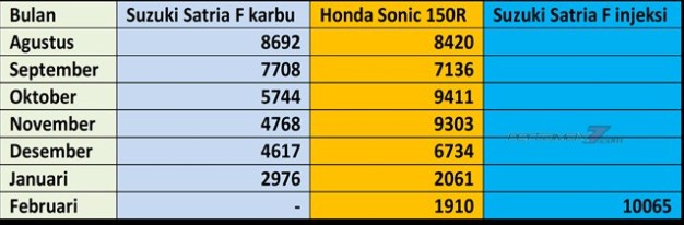 Lantas bagaimana respon masyarakat akan kehadiran Satria F150 Fi ini masbro..??? Ternyata masyarakat begitu antusias. Data AISI yang MMz ambil dari pertamax7 menyebutkan bahwa penjualan Satria F150 karbu yang sempat terperosok ke angka 2976 unit di bulan Januari langsung meroket ke angka 10065 unit di bulan Februari. Bandingkan dengan Honda Sonic yang hanya terjual sebanyak 1910 unit saja pada bulan yang sama..