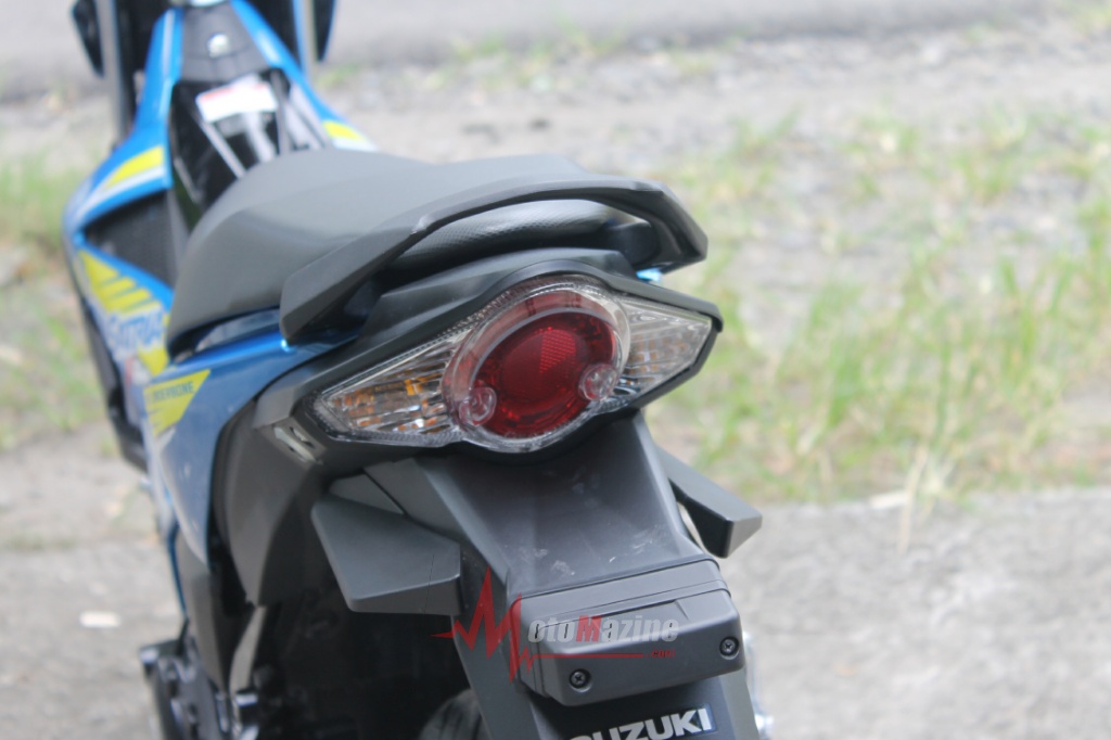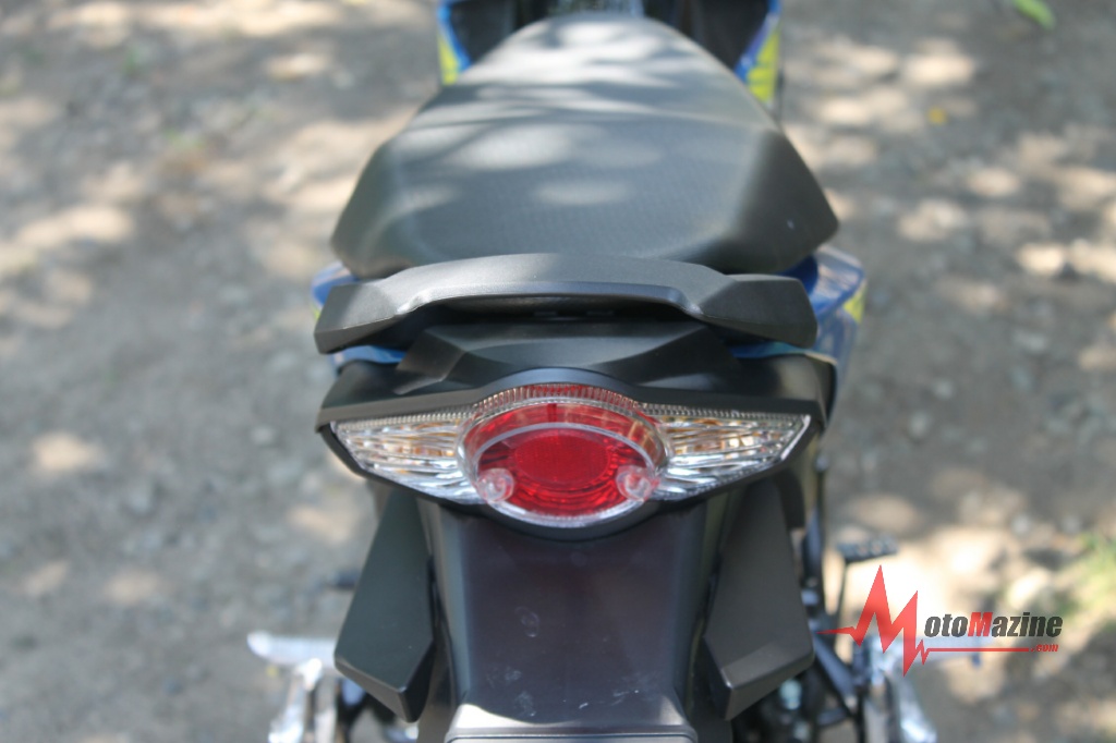 Dan jika ditanya bagaimana pendapat MMz perihal buritan Suzuki Satria F150 Fi ini, saya akan jawab cukup seksi kok. Mika stoplamp membulat layaknya donat dipadu lampu sein yang menyipit ke samping justru membuatnya terasa pas.. Dipadu spakbor yang slim dan sayap “winglets” di bagian sisi kanan dan kiri spakbor belakang sebelah atas (bawah jok boncenger) membuat tampilan buritan Satria FU injeksi ini benar-benar terlihat sebagai barang dan model baru. Walaupun sesungguhnya tetap menggunakan garis desain Satria FU karburator.