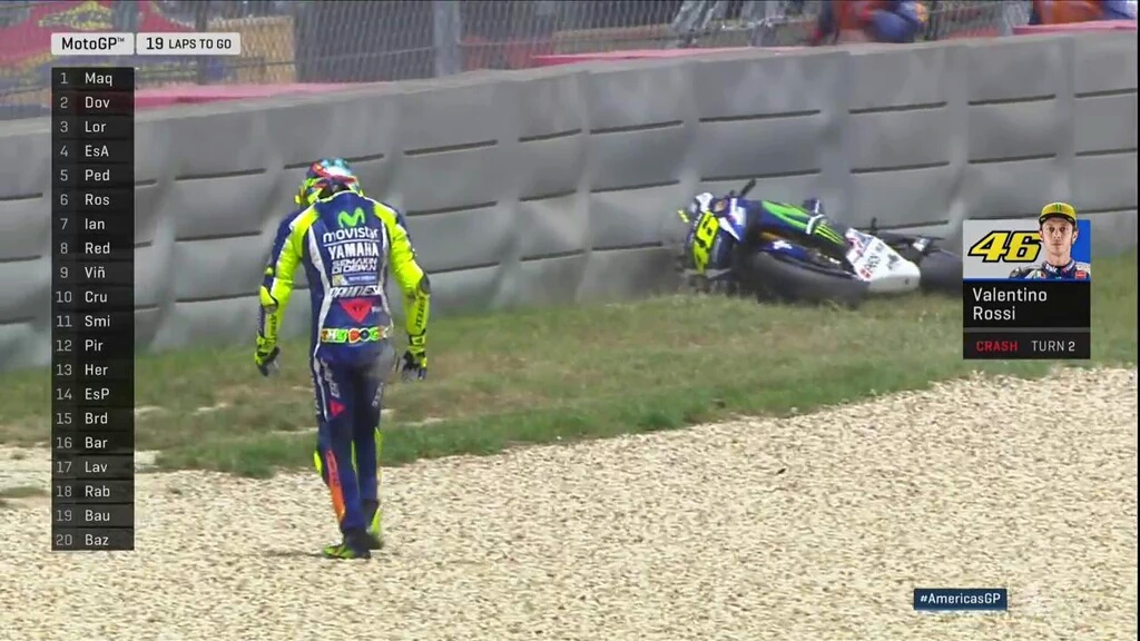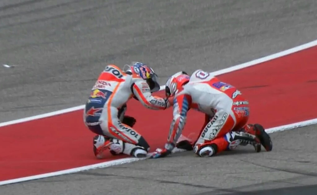 Namun yang paling menyesakkan adalah nasib yang dialami oleh Andrea Dovisiozo. Pebalap Ducati yang tengah nyaman membalap di posisi ketiga ini tetiba saja harus terjatuh karena tertabrak motor Dani Pedrosa yang mengalami crash di tikungan pertama. Kejadiannya sih mirip saat MotoGP Argentina kemarin. Hanya saja kemarin Dovi dijatuhkan oleh rekan setimnya sendiri, Iannone.