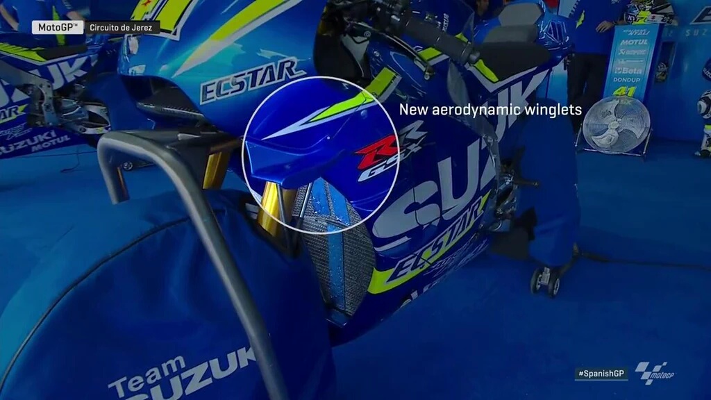 Tak tanggung-tanggung, Suzuki dan Aprilia langsung memasang winglets yang terbilang cukup lebar. Secara penempatan pun kali ini mereka cukup klop. Berada di samping sisi kanan dan kiri air ram. Posisi dimana Yamaha lah yang pertama kali menggunakannya pada MotoGP sesi Misano musim 2015 lalu. Kenapa Yamaha yang pertama? Sebab saat itu Ducati sekalipun masih memasang winglets di sisi kanan dan kiri fairing.