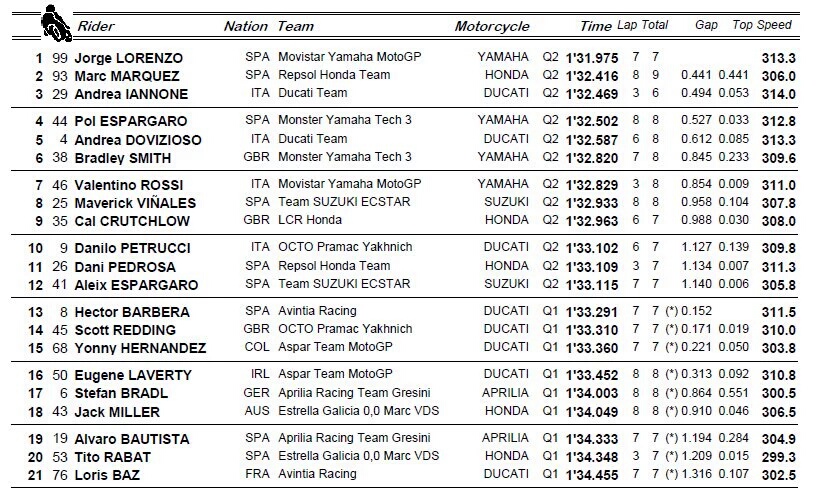 Lorenzo yang memang terlihat sangat kuat semenjak FP3 dan FP4 terus menunjukkan trend positif dan akhirnya berhasil memuncaki perolehan waktu di sesi Q2 dengan catatan waktu menyentuh angka 1’31.975 detik. Meninggalkan Marquez di posisi dua dengan gap mencapai 0.441 detik dan Iannone di posisi tiga dengan gap sebesar 0.494 detik atas Lorenzo.