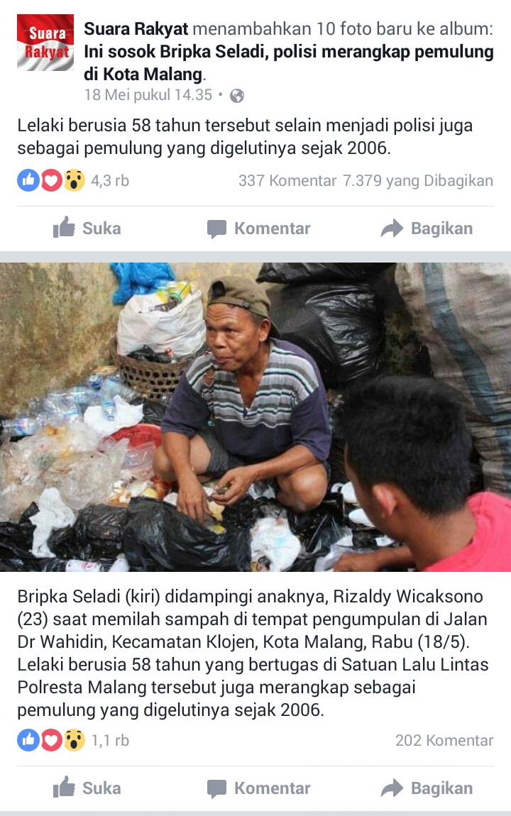 Motomazine.com – salam safety riding bro sis.. Sosok polisi asal Kota Malang Jawa Timur ini sontak menjadi bahan perbincangan viral di dunia maya. Sebut saja beliau adalah Bripka Seladi (58), anggota Satuan Lalu Lintas Polresta Malang yang diluar profesinya sebagai Polisi, juga nyambi sebagai pemulung barang-barang bekas.