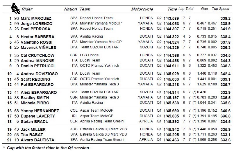 Marquez yang sempat kesulitan di awal sesi latihan bebas akhirnya mampu membukukan laptime tercepat di angka 1’43.589 detik lebih cepat 0,467 detik atas Lorenzo dan 0, 718 detik atas Pedrosa.