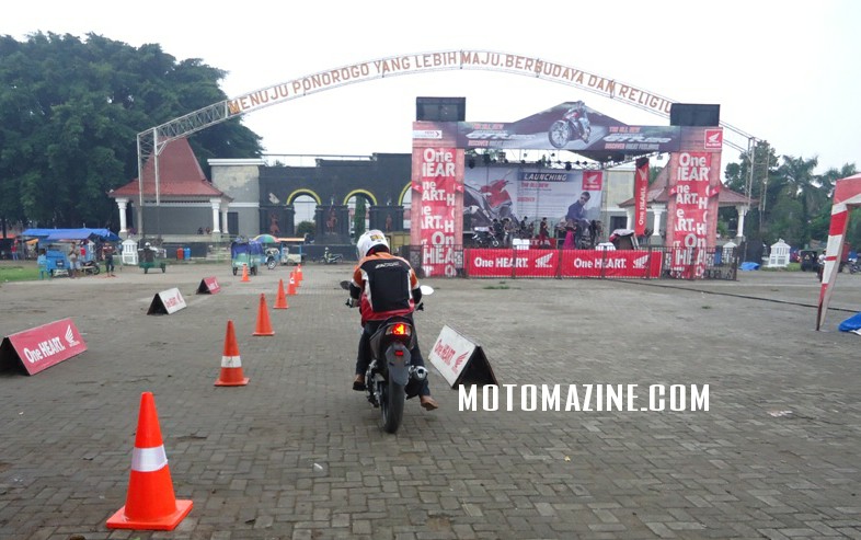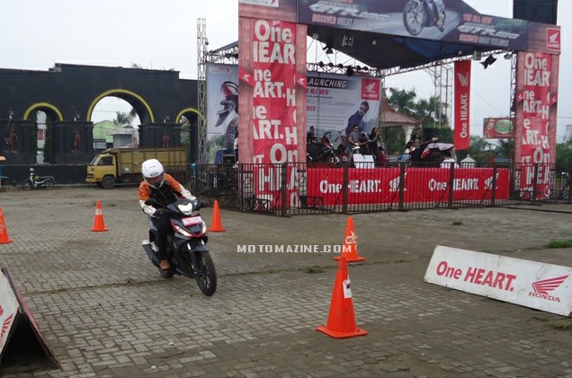 Sempat MMz gunakan meliuk-liuk zig zag diantara cones yang disediakan panitia, feel yang saya rasakan adalah smooth, enteng namun sedikit rigid. Entah apakah ini terbawa akibat riding style MMz, namun untuk urusan satu ini, dibanding dengan kompetitor sekelas dan sevarian dari Yamaha, saya merasakan jika sang Raja justru lebih enak dan nurut (imo).