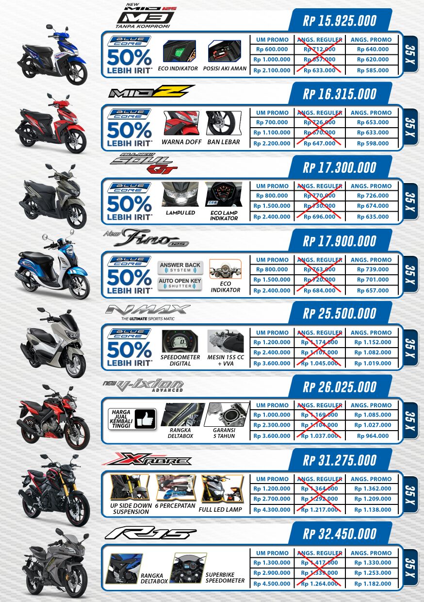 Jadi bagi anda para konsumen setia Yamaha jangan lewatkan kesempatan ini, guna mendapatkan motor Yamaha baru dengan angsuran yang jauh lebih murah. So…. Tunggu apalagi.. segera miliki motor baru dari Yamaha dan datangi dealer dealer terdekat untuk mendapatkan info detailnya (MMz)