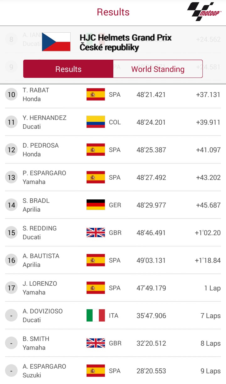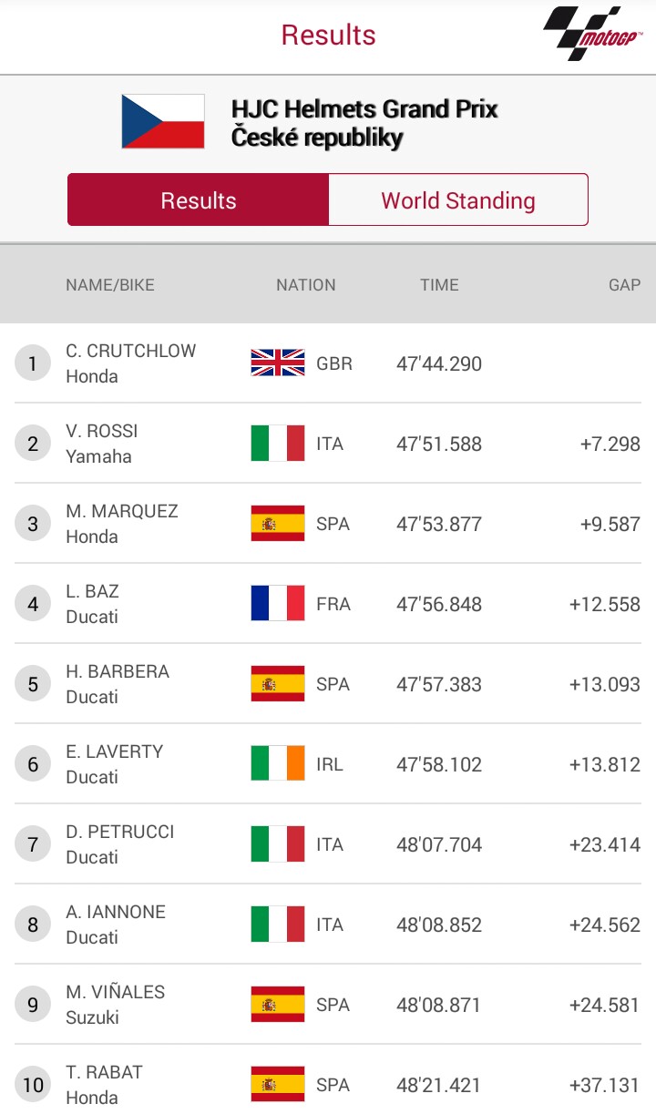So.. Pada akhir balapan Crutchlow sukses menjadi pebalap pertama yang melintasi garis finish MotoGP Brno, disusul Rossi dan Marquez yang di akhir-akhir perlombaan juga berhasil menuntaskan perlawanan Iannone, Barbera dan Loris Baz..