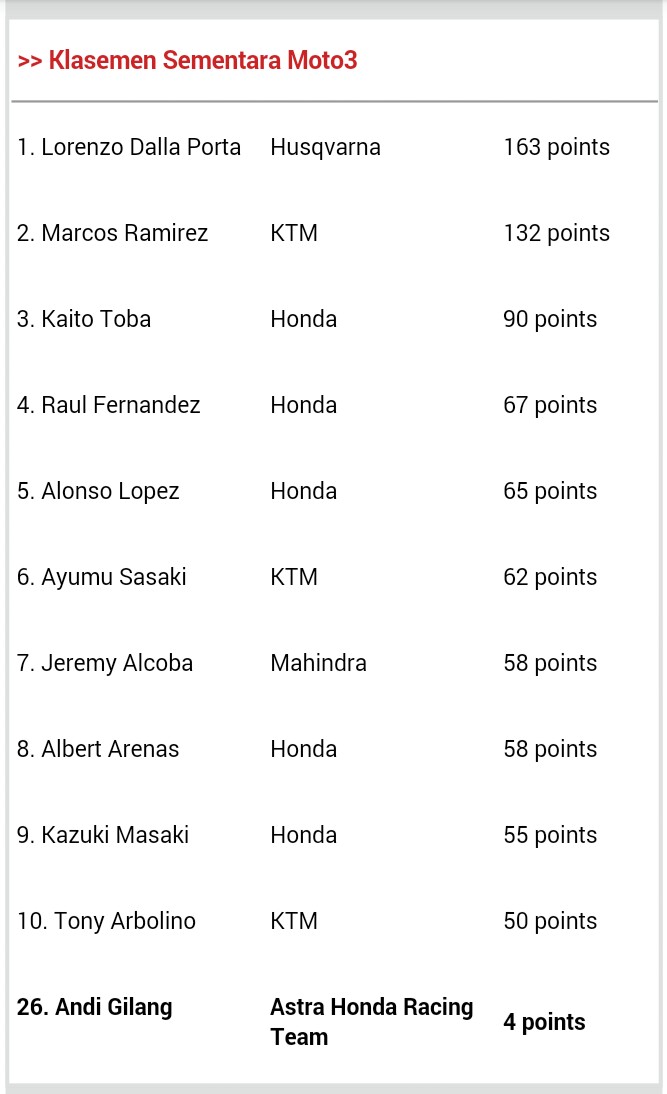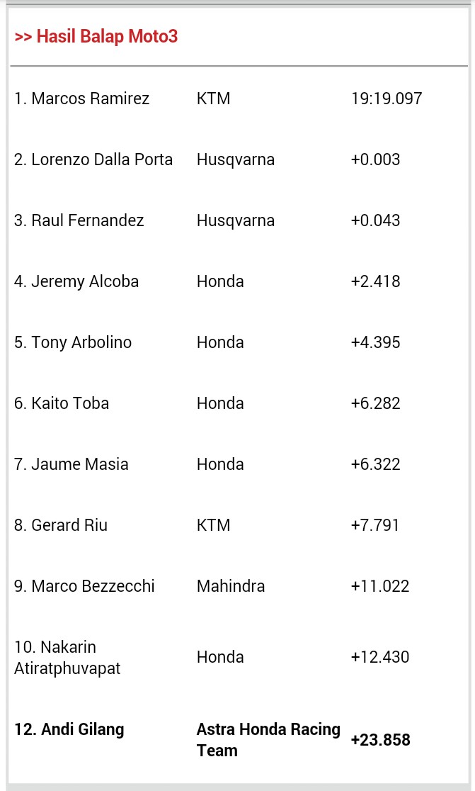 Sementara Andi Gilang menghadapi tantangan yang berbeda di kelas Moto3. Pebalap asal Bulukumba ini harus menjalani balapan dengan setup motor yang belum sempurna selama sepekan ini. Meski masih merasa tidak nyaman dengan setup tersebut, pebalap Astra Honda Racing Team ini tetap percaya diri dan memperlihatkan catatan waktunya dengan konstan saat balapan di kelas Moto3 Junior World Championship. Dengan kondisi cuaca sirkuit yang panas di Portugal Selatan ini, Andi Gilang berhasilfinish pada salah satu lintasan terberat di ajang CEV International Championship ini. Kendati beratnya balapan menyebabkan 12 pebalap terjatuh di sirkuit ini, Pebalap Moto3 dari Indonesia ini berhasil menjalankan strategi jitu untuk mengatasi masalah grip ban yang kurang menggigit saat memacu motornya. Andi Gilang menunjukan konsistensi dan kesabaran menunggu saat yang tepat untuk menyalip. Pada lap-lap akhir, Andi Gilang pun menunjukkan pertarungan yang sengit dengan Davide Pizzoli, pebalap dari Italia. Andi Gilang menyalip di dua tikungan sebelum garis finish, meraih posisi 12 dan mendapat 4 poin di klasemen kejuaraan Moto3 Junior World Championship ini.