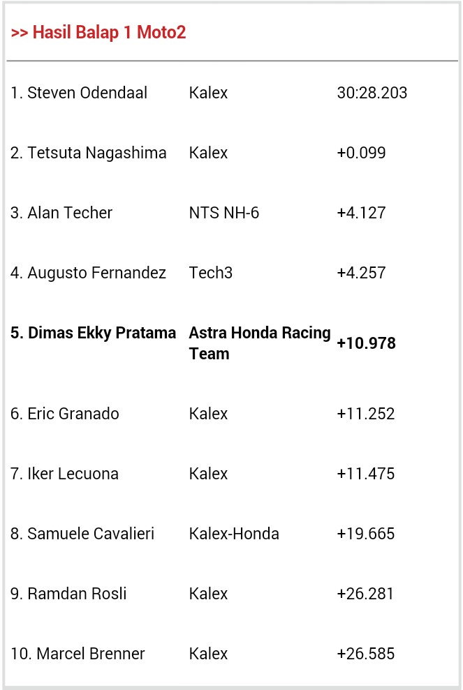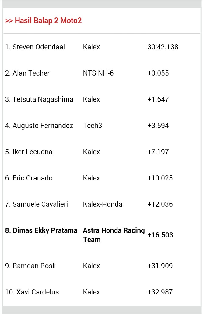 “Balapan kali ini sangat berat dengan suhu yang sangat panas. Suhu udara hari ini merupakan yang terpanas dalam minggu ini. Di race pertama saya bisa menyelesaikan balapan dengan baik merebut posisi 5, di race 2 suhu lebih panas lagi ditambah hambatan angin sangat besar di trek lurus yang tidak bisa dihindari. Posisi ban belakang juga terussliding, sehingga motor lebih susah dikendalikan. Di lap awal, saya sudah bisa mendekati pebalap tercepat di grup depan, tapi saya tidak berhasil mempertahankan kecepatan untuk terus mengikuti mereka. Tapi, saya banyak mendapatkan pelajaran hari ini dan bisa mengambil pelajaran berharga ketika menghadapi balap di tengah udara panas dan angin kencang. Dengan pengalaman ini, saya rasa kedepannya bisa melangkah lebih baik lagi,” ujar Dimas Ekky.