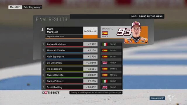 Namun kembali, di Motegi sepertinya dewi fortuna memang sedang menancapkan panah lucky nya kepada pebalap bernomor 93 ini. Tak lama, tepatnya 4 lap jelang balap usai, pebalap berjuluk Porfuera, Jorge Lorenzo pun tersungkur ke aspal akibat kehilangan traksi ban depan juga. Dengan begitu, maka otomatis Marc dan kru pun tersenyum lebar. Finish di posisi pertama akhirnya mengantarkan Marquez meraih poin penuh 25 poin sehingga menjauhkan poinnya dengan Rossi di posisi dua dengan gap sebanyak 77 poin. Menyisakan tiga balapan lagi, artinya tinggal 75 poin saja yang diperebutkan, maka praktis Marquez lah yang berhak memboyong tropi juara juara dunia MotoGP 2016.