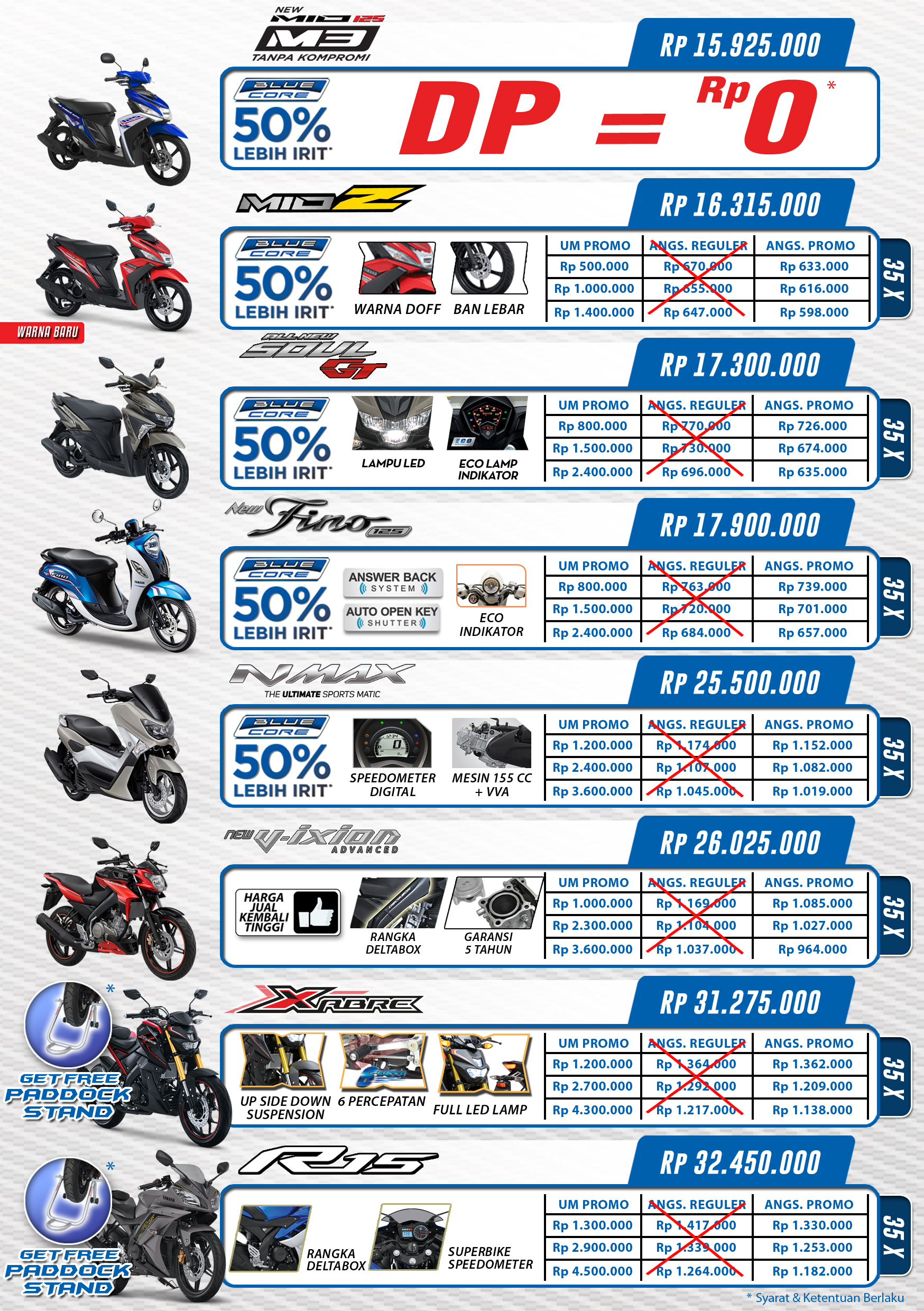 Program ini diadakan mulai tanggal 15-31 Oktober 2016. Dengan Down Payment Rp.0, anda bisa membawa motor kesayangan anda yakni Mio M3 ke garasi rumah anda. Program ini berlaku untuk Mio M3 all varian dengan panjang jangka kredit sebanyak 30 bulan.
