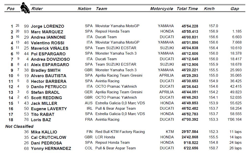 Dengan hasil ini artinya Lorenzo berhasil mempersembahkan kado perpisahan termanis, berupa kemenangan di negara sendiri untuk Yamaha. Selamat tinggal Jorge, teruslah berkarya untuk Ducati musim depan… (MMz)