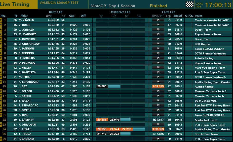 Dan di luar dugaan, Maverick Vinales yang meninggalkan Suzuki untuk gabung bersama Valentino Rossi di tim Movistar Yamaha berhasil menjadi pebalap tercepat dengan torehan waktu menyentuh angka 1’30.320 detik, berselisih tipis dengan teamate nya Valentino di posisi dua.