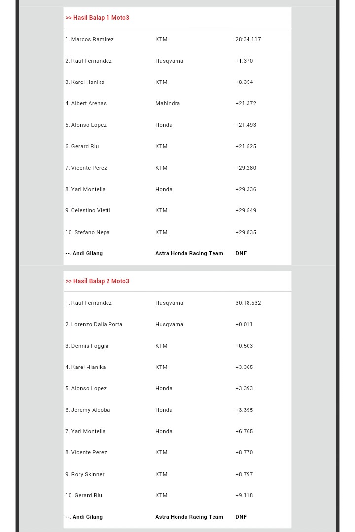 “Saya sudah melakukan persiapan yang matang menghadapi seri terakhir ini, dan saya sangat yakin dengan kemampuan motor saya. Hasil kualifikasi memang tak sesuai harapan, tapi saya yakin bisa bersaing di grup depan. Karena terkena pinalti, di race pertama saya start urutan 30, tapi saya terus melakukan tekanan dan berhasil bergabung dengan pebalap grup depan. Ketika saya di posisi ke-7, saya terjatuh di tikungan 4. Saya mencoba mengulangi di race kedua, tapi kurang yakin dengan roda belakang karena susah dikendalikan di beberapa tikungan. Akhirnya, ban belakang terus sliding, saya berusaha mengendalikan motor, tapi kaki saya menyentuh pedal rem belakang dan high side. Tahun ini menjadi pengalaman berharga bagi saya bersaing di kelas Moto3 Kejuaraan Eropa. Saya berharap tahun depan bisa lebih baik lagi,” ujar Andi Gilang.