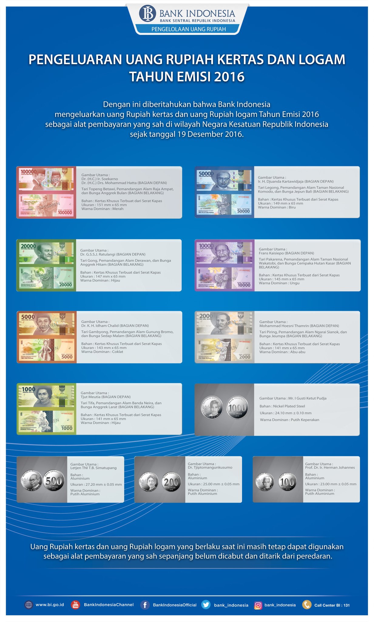 Uang kertas dan logam wajah baru ini sendiri akan segera beredar dan diedarkan oleh Bank Indonesia. Nominalnya masih sama, yakni tujuh macam nominal uang kertas, mulai dari 1000, 2000, 5000, 10000, 20000, 50000, dan 100000. Sementara uang logamnya terdiri dari uang logam pecahan 100, 200, 500 dan 1000.