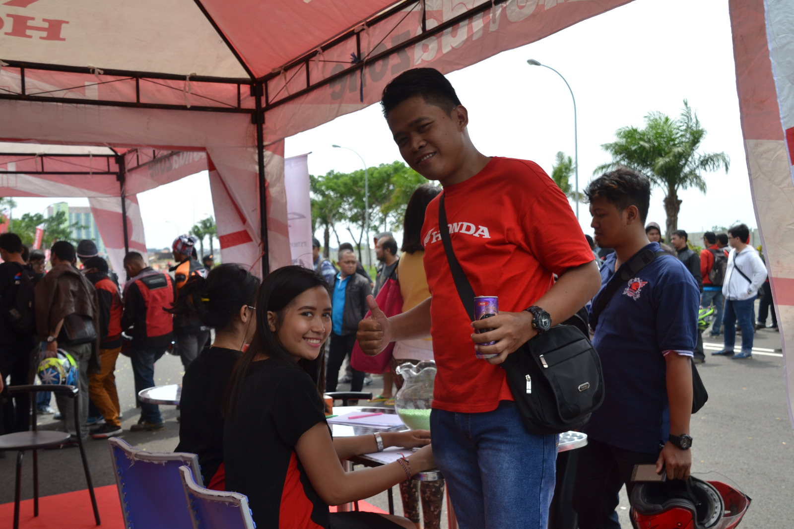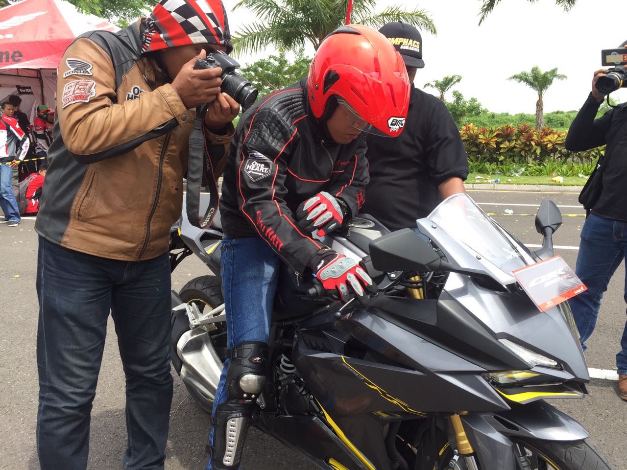 Tarik tuas kopling, masuk ke gigi 1. Lembut.. Tanpa ada suara cekrak. Loh kok gak naikin standar samping? Gak usah, sebab dari tester sebelumnya saat berhenti standar samping sudah tak diturunkan lagi. Pak Wasis lah yang memeganginya.. Hehe.. Oh ya, perlu bro sis ketahui. Antrian dari pagi, sejak acara dibuka sudah mengular luar biasa. Estimasi ada lah kalau sekitar 500-an orang. Tanda jika mereka sangat antusias menjajal performa All New CBR250RR ini.