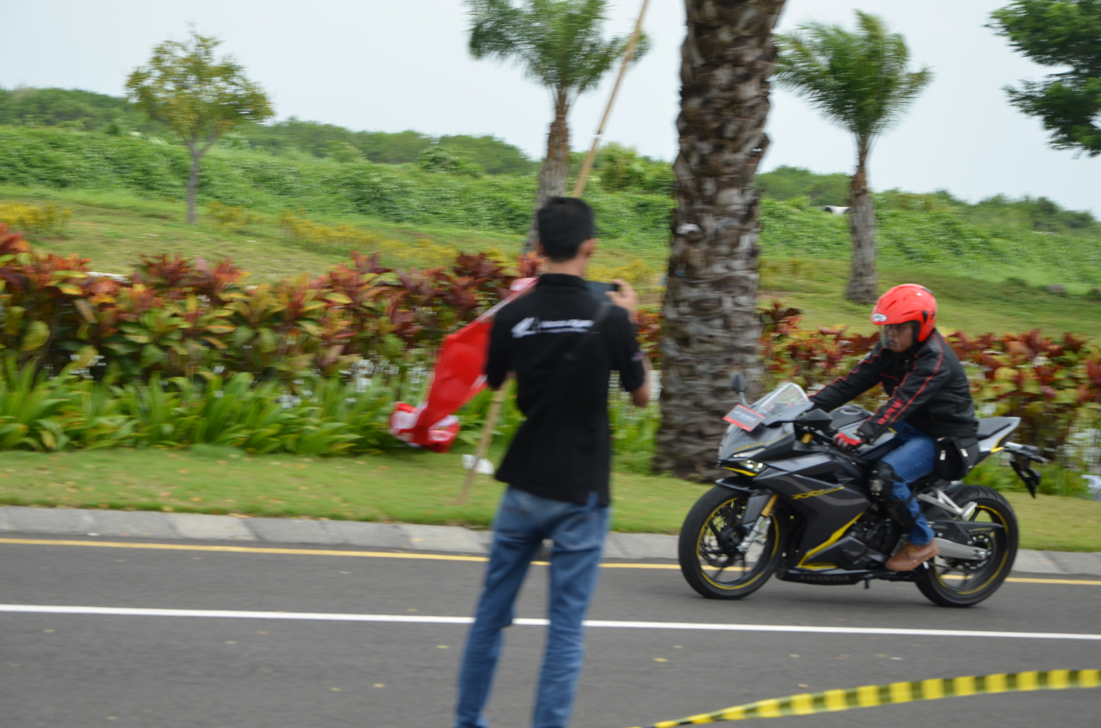 Acara sendiri digelar pada hari Sabtu (17/12) yang lalu. Mengambil tempat di jalanan menuju cluster di Grand Island Pakuwon sepertinya memang pilihan tepat. Sebab jalanan selebar 20 meteran itu masih begitu mulus dan rata. Dengan panjang trek sekitar 200an meter, kesempatan untuk mengeksplor tenaga bawah lebih bisa dilakukan. Ya meskipun tak bisa maksimal. Sebab trek yang dibuat hanya lurus dibagi menjadi dua lintasan, dimana tester hanya diperkenankan bolak-balik saja. Usul MMz sih jika kelak Honda menggelar acara serupa, dengan memanfaatkan lebar trek, mungkin lintasan bisa dibuat berkelok-kelok menggunakan cone, sehingga tester benar-benar bisa merasakan bagaimana handling dan agility si motor ketika harus diajak meliuk-liuk menaklukkan tikungan. Layout bisa dibikin semacam trek safety practice di Learning Center MPM Sedati (imo).