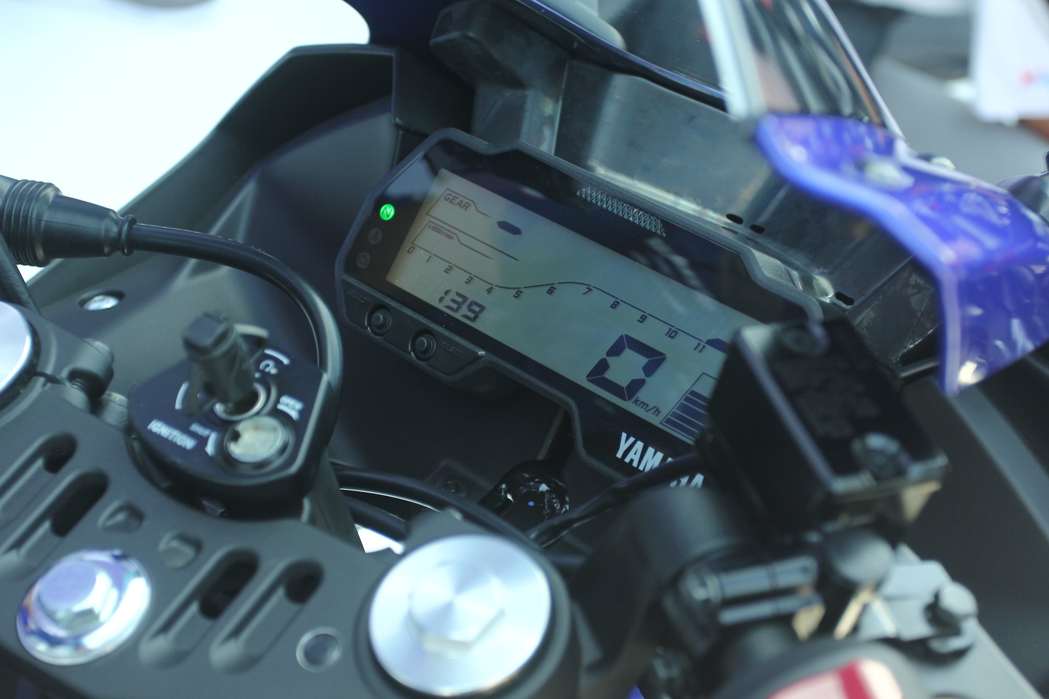 Saat duduk di atas motor All New R15, Anda disuguhkan pemandangan desain cockpit yang Racy dan Luxury. Tampilan speedometer full digital dilengkapi shift timing light yang akan memberi tanda kepada pengendara untuk berpindah percepatan dan bisa di-setting sesuai keinginan pengendara. Gear position untuk mengetahui posisi percepatan saat berkendara. Anda juga bisa memasukkan identitas nama Anda enam digit pada tampilan LCD speedometer. Juga beberapa fungsi lain yang membuat Multi Information Display-nya semakin informatif.
