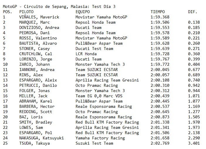 Sementara pembalap Repsol Honda, Marc Marquez, juga mulai menunjukkan tajinya. Doi yang begitu kesulitan di hari pertama dan kedua tes akhirnya mampu berbicara dan memperbaiki catatan waktunya dan terpaut waktu tipis, +0.138 detik saja atas Vinales yang berhasil membukukan waktu 1m59.368 detik.