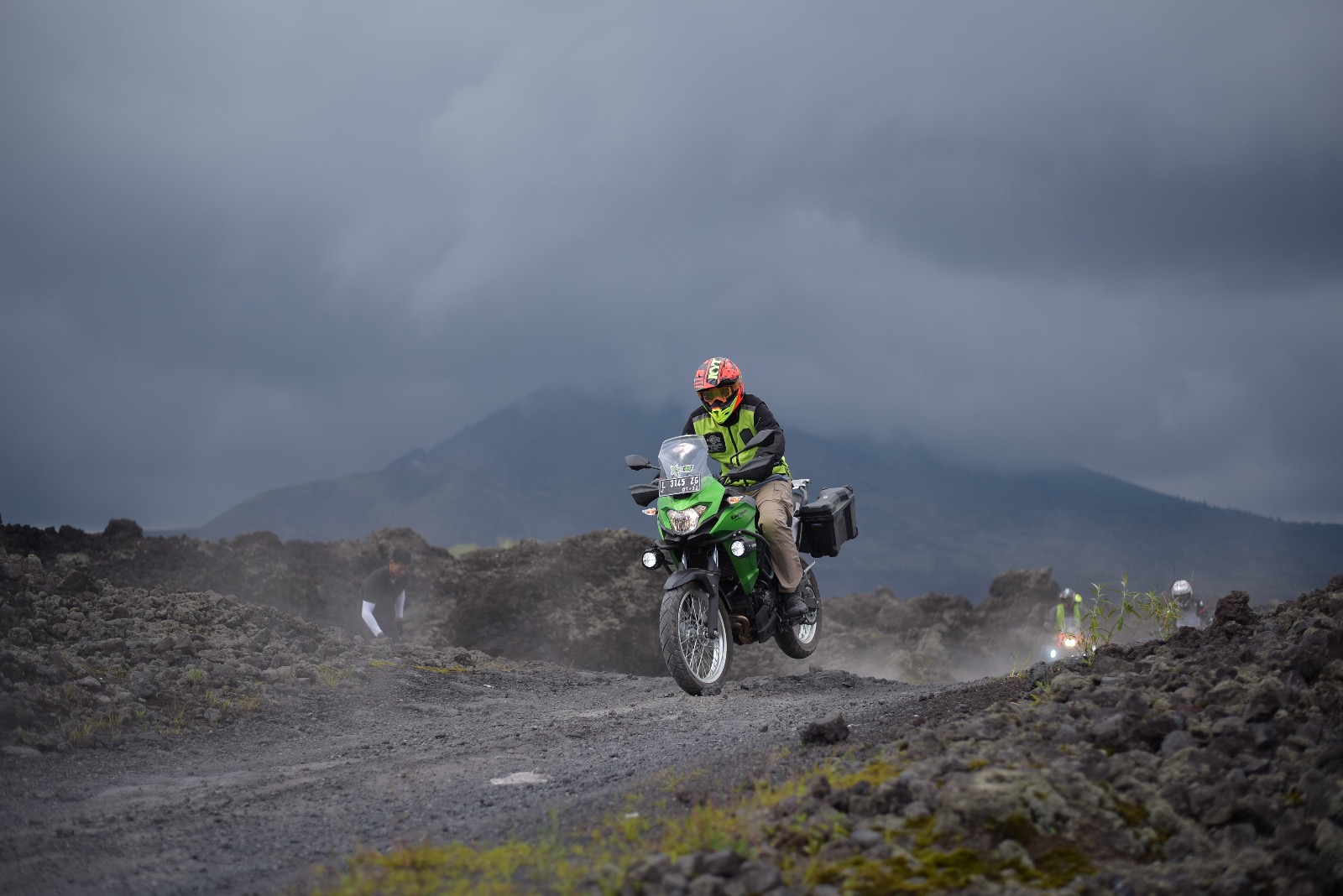 Di sana kami akan kembali dihadapkan pada medan berat dengan komposisi berupa pasir dan kerikil hasil muntahan lava yang kin telah membatu. Kembali ke tagline “ANY ROAD ANY TIME” pihak Kawasaki sepertinya memang ingin menguji ketangguhan Versys-X250 ini di segala medan. Tak puas bermandikan pasir di Bromo, kali ini sang adventure bike seperempat liter ini dihadapkan pada medan yang lebih berwarna. Ada beberapa material berupa pasir lembut nan dalam juga, namun kebanyakan justru susunan batu kerikil yang bisa saja membuat rider kehilangan keseimbangan, bahkan kepercayaan diri untuk menaklukkan trek tersebut. Dan benar saja, di Black Lava nyatanya tak sedikit juga peserta yang harus jatuh bangun gegara terpeleset atau salah posisi berhenti. Oh ya, di Black Lava ini juga kami harus kembali menjalani beberapa adegan untuk keperluan video dan pengambilan foto. Tak dapat dipungkiri memang, Tuhan mencipta lokasi tersebut dengan sangat indahnya sehingga sangat pas apabila dijadikan sebagai background pengambilan foto maupun proses penggarapan video. Dan benar saja, di sana kami juga bertemu dengan beberapa komunitas yang sedang melakukan proses syuting.