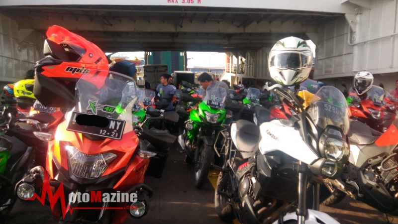 Sekitar pukul 07.00 pagi rombongan sudah bersiap di pelabuhan. Tak butuh waktu lama, kapal yang akan kami gunakan untuk menyeberang pun siap. Satu per satu motor masuk ke dalam lambung kapal untuk diparkir. Oh ya bro sis, tips baru nih.. Berdasarkan briefing yang diberikan oleh RC kami, bro Iqbal, usahakan motor dalam keadaan masuk ke gigi 1 saat diparkir di dalam kapal. Sebab, jika sewaktu-waktu terjadi goncangan akibat ombak yang besar misalnya, anda tak perlu khawatir motor bergeser, berpindah atau bahkan roboh.