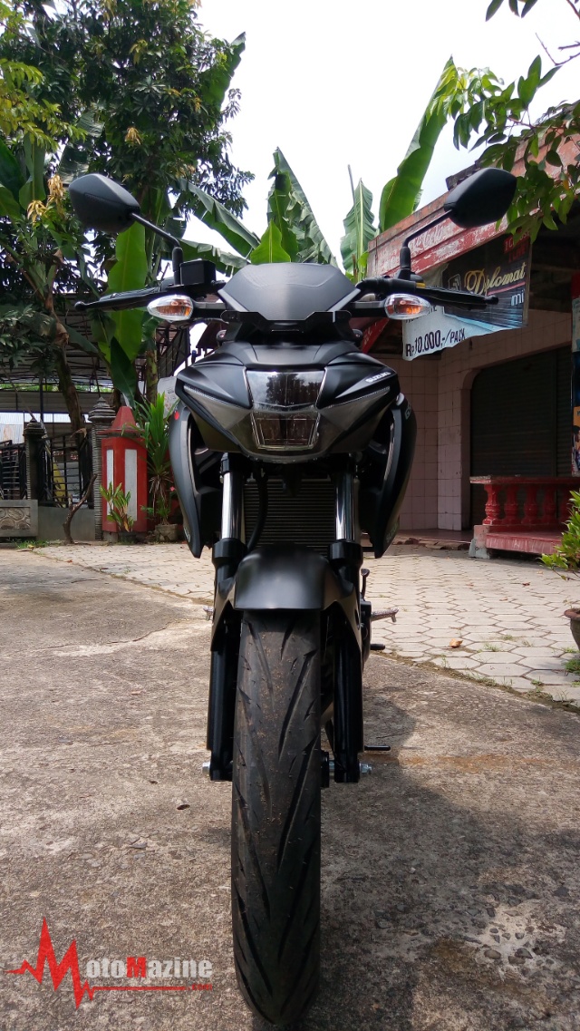 Yawes, parkirkan motor, MMz langsung melipir mencoba mendekat dan mengamati versi naked dari GSX-R150 ini. Jujur bro sis, karena memang letaknya paling depan, mata seakan sulit teralih dari perhatian terhadap headlamp. Secara desain headlamp sendiri, GSX-S150 memiliki basic garis yang sama dengan si fairingnya. Hanya saja, Suzuki membuat cover baru agar lebih matching membungkus headlamp berteknologi LED tersebut.